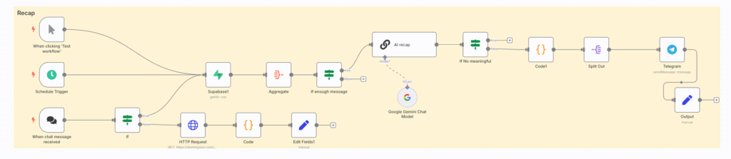 Đây là một workflow n8n giúp thu thập tin nhắn từ các nhóm Telegram, lưu trữ chúng vào Supabase, và tóm tắt nội dung thảo luận qua AI. Sau đó, kết quả được gửi lại qua Telegram. Workflow hoạt động hoàn toàn tự động theo lịch (hoặc thủ công khi test).